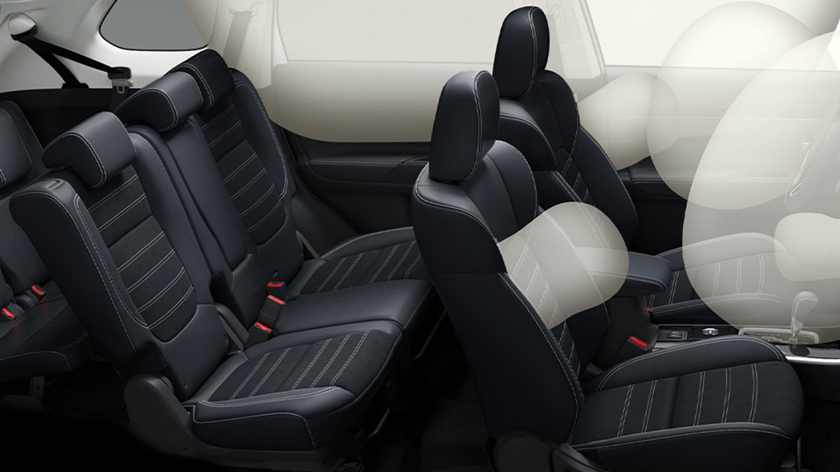 Trong trường hợp xảy ra va chạm, hệ thống 7 túi khí an toàn sẽ bảo vệ tất cả hành khách khỏi chấn thương do va đập mạnh. Hệ thống 7 túi khí bao gồm: 02 túi khí cho hành khách phía trước, 02 túi khí bên cho hàng ghế trước, 02 túi khí rèm và 01 túi khí bảo vệ đầu gối người lái.