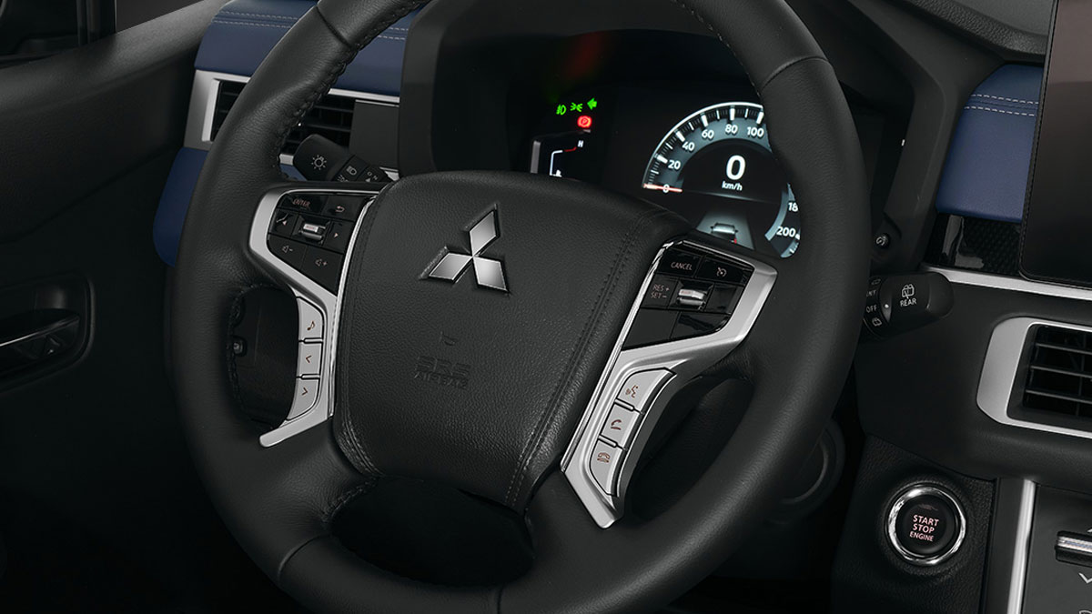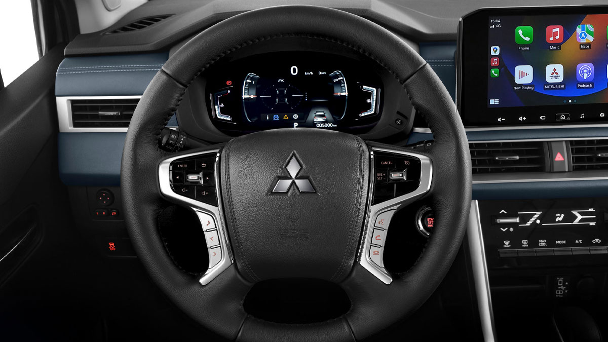 Xpander Cross 2023 mới với phong cách SUV đặc trưng được thể hiện thông qua từng chi tiết trong nội thất: Vô lăng 4 chấu thể thao được thừa hưởng từ mẫu xe Pajero Sport tích hợp các phím điều khiển đa chức năng mang đến sự thuận tiện trong quá trình thao tác và vận hành xe. Đồng hồ kỹ thuật số sau vô lăng, có kích thước lớn 8 inch giúp hiển thị trực quan đa dạng thông tin, dễ sử dụng với màu sắc bắt mắt hơn.